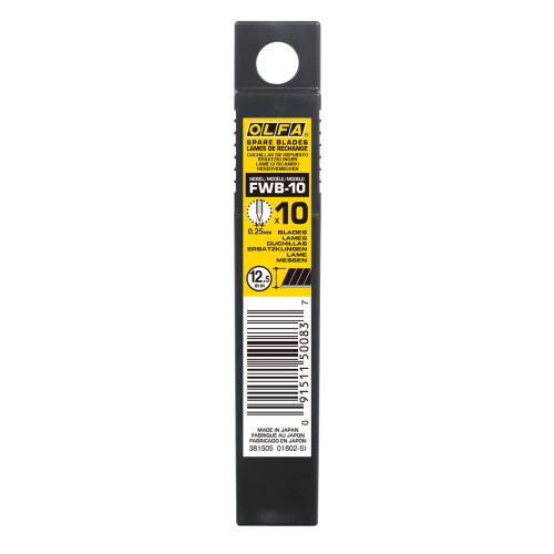 De OLFA FWB-10 bevat 10 uiterst scherpe, extra dunne zwarte afbreekmesjes van slechts 0,25 mm dik, speciaal ontworpen voor het FWP-1 afbreek mes. Deze UltraSharp Black Blades zorgen voor een uitzonderlijk glad en nauwkeurig snijresultaat, ideaal voor werkzaamheden waarbij absolute precisie vereist is.