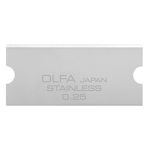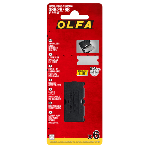 De OLFA® GSB-2S/6B is een set van 6 hoogwaardige roestvrijstalen reservemessen, speciaal ontworpen voor de OLFA® GSR-2 compacte glasschraper.